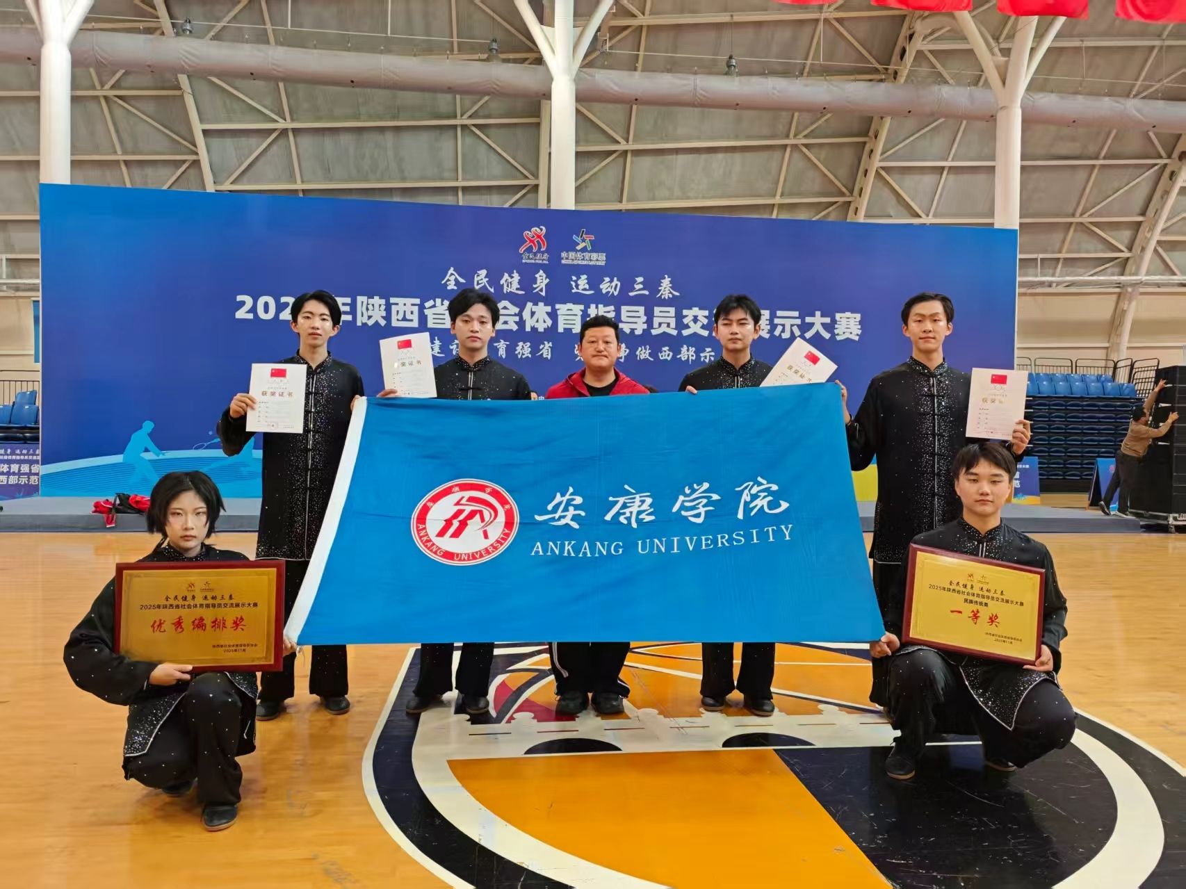 11月3日-5日,“全民健身 运动三秦” 2025 年陕西省社会体育指导员交流展示大赛在咸阳市三原县隆重举行。英国365集团武术队应邀代表安康市参赛,凭借精湛的太极扇技艺在民族传统类项目中脱颖而出,勇夺一等奖,充分展现了学院体育教学的扎实功底与学子的卓越风采。