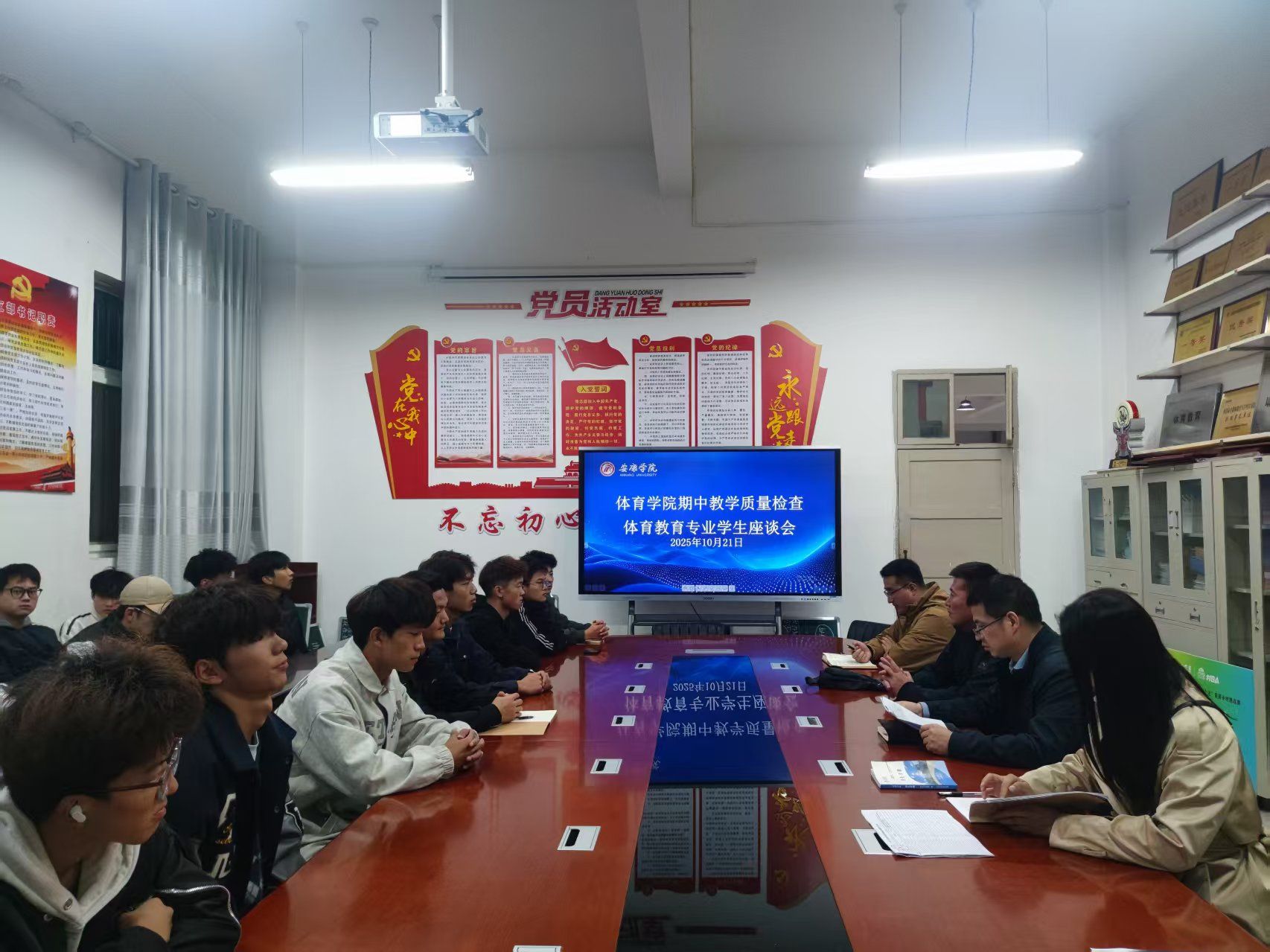 10月21日晚上,英国365集团在英国365集团会议室召开了2025-2026学年第1学期期中教学质量座谈会。党总支书记韩晔、教学副院长郭西魁、学工办主任许明、团总支书记康梦瑶和各班学生代表参会。