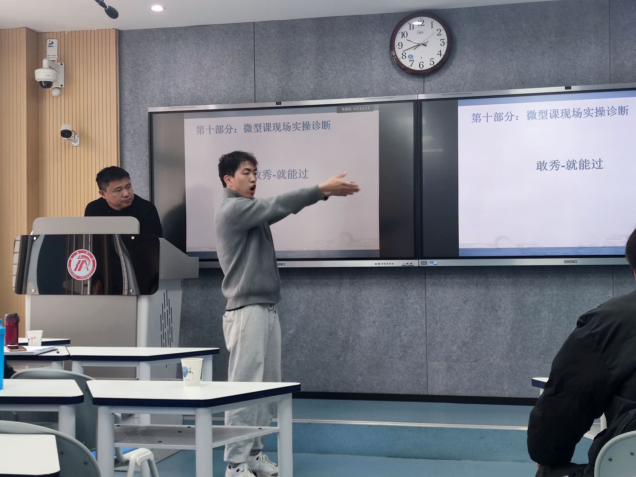活动的最后是“实战演练”环节。在场学生踊跃上台,进行模拟授课演示。三位导师现场担任评委,仔细观察每一位同学的表现,并从教案设计、语言表达、教姿教态到课堂组织等方面,给予了针对性极强的一对一指导。这种沉浸式的互动体验,使学生在真实的教学情境中检验了学习成果,明确了未来的改进与提升方向。